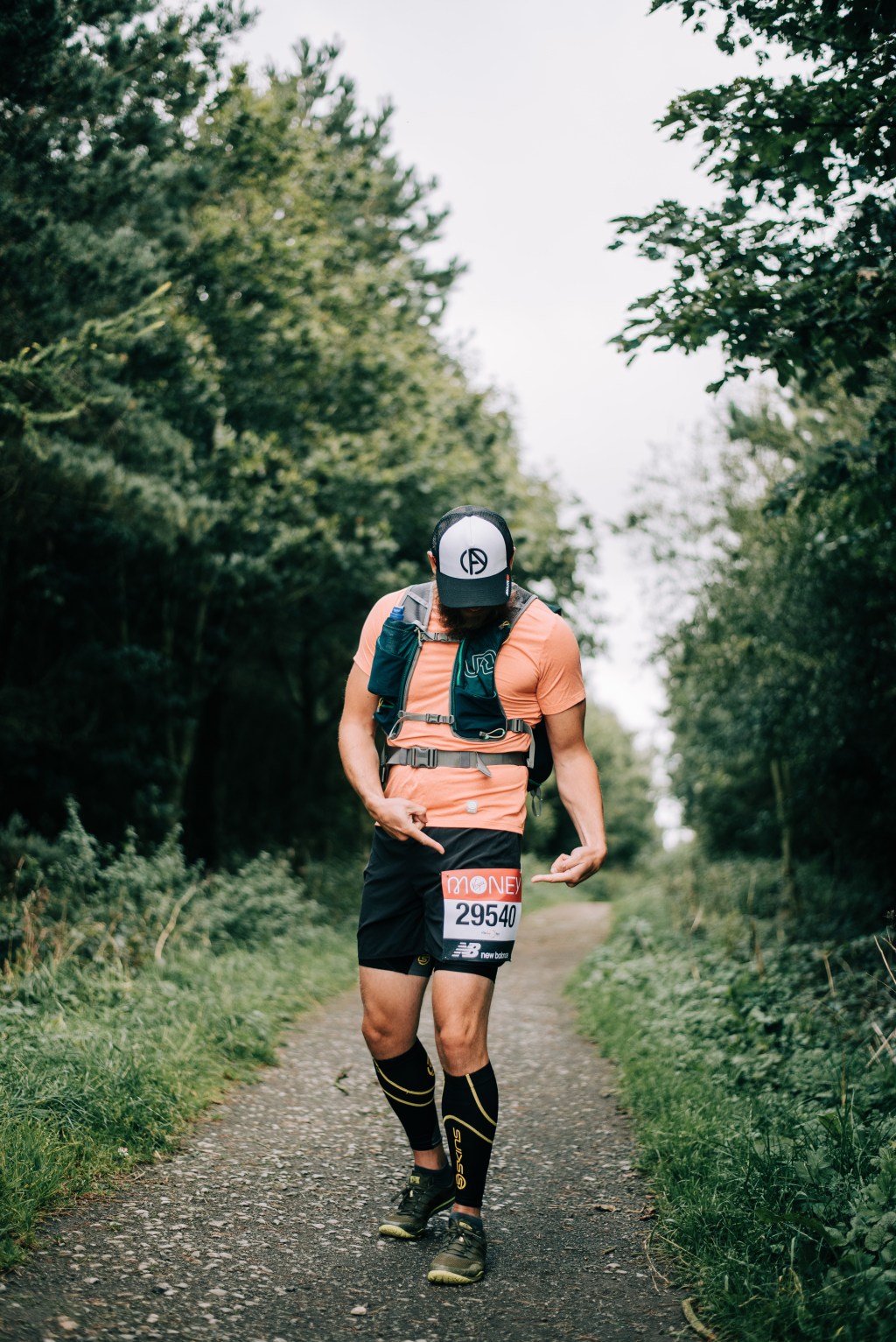 Kit List – Skins Compression tee, shorts, calf sleeves. Merrell trail gloves. Ultimate Direction Fastpack 35. Absolute 360 cap.