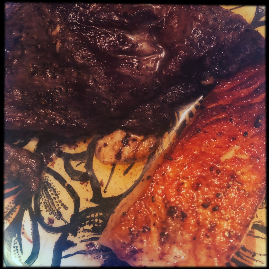 Bacon, cheeseburgers, salmon